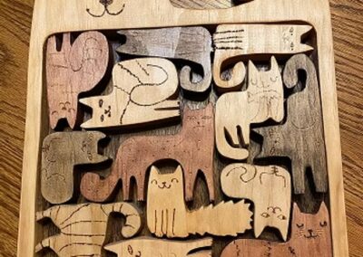Since retirement, I’ve found I enjoy designing and cutting out jigsaw puzzles. My wife finds interesting puzzle designs on the internet and says, “Here, can you do that?” This challenge spurs my creativity and encourages me to keep cutting. From simple 4-piece puzzles for nieces and nephews, to more complicated designs, I work the scroll saw to hew out fun and creative puzzles to share and, in the future, to sell.