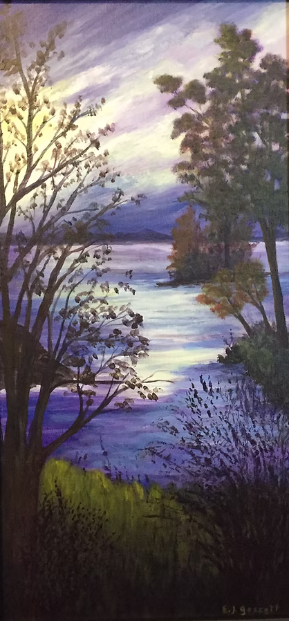 Gossett took several art classes at Ball State University while working on her bachelor’s degree in another field in the 1960s. She has taken watercolor lessons from Brian Gordy and painting lessons from Charlene George in the past. She participated in the yearly T.C. Steele paint-outs in Brown County for several years and exhibited her work in various galleries in Brown County during that time.